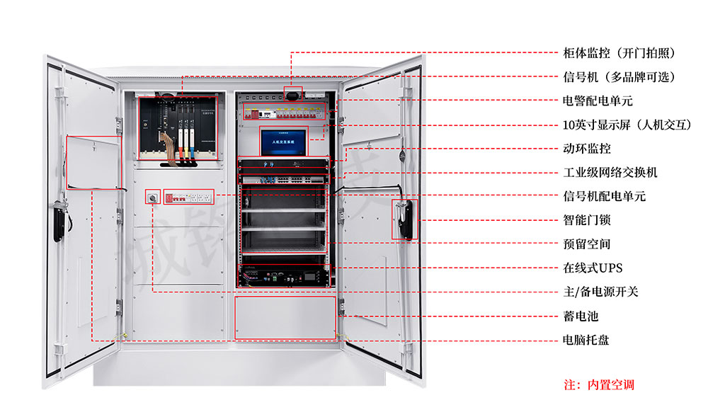 機(jī)柜由柜體、動(dòng)環(huán)監(jiān)控、在線式UPS+電池組、配電單元、機(jī)柜照明、通風(fēng)系統(tǒng)、恒溫空調(diào)等配套設(shè)備組成;整機(jī)隔熱防水防塵,循環(huán)風(fēng)道、精密空調(diào)提供恒溫保障,為監(jiān)控?cái)z像機(jī)、傳輸設(shè)備、交通信號(hào)機(jī)、交通信號(hào)燈、雷視一體機(jī)、監(jiān)控補(bǔ)光燈等設(shè)備的正常運(yùn)行及智能運(yùn)維管理提供有力保障。